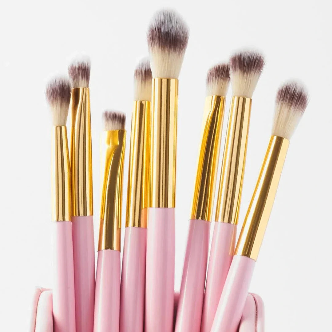 Embrace luxury with the Studded Elegance 12 Piece Brush Set Pink. Complete with a sleek embellished holder, this collection gathers face and eye essentials for the seamless application of liquid foundation, creams, and powders. Each brush features silky-soft, synthetic bristles, a gleaming gold ferrule, and smooth pink handles – perfect for defining your features while looking beautiful on your vanity.