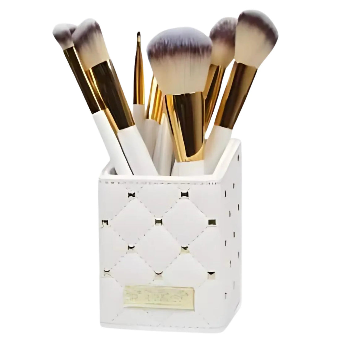Adorn your vanity in luxury with White Studded Elegance 12-Piece Brush Set, an essential collection of face and eye brushes that offers a perfected complexion and enchanting eye looks. Each brush features whisper-soft synthetic bristles bundled with a gold ferrule. Plus, the sleek embellished holder keeps tools organized in style.