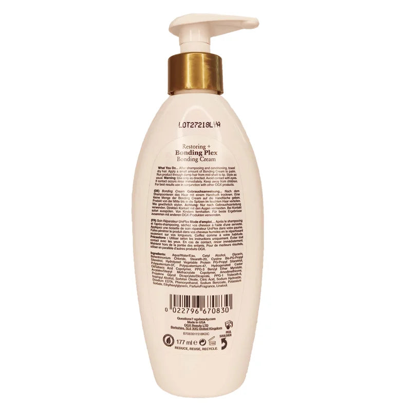 Set off smooth, strengthened and refreshed hair with the OGX Restoring Bonding Plex Bonding Cream, the third step in salon technology conditioning system. Prevent damage and maximize moisture retention for healthier looking hair while providing a protective barrier for continuous styling.