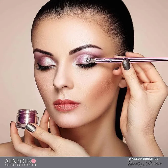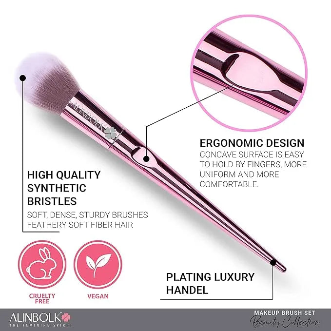 ALINBOLK Makeup brushes are very dense and soft, ideal for evenly blending blush, loose powder, highlighter, eyeshadow, and foundation. With a durable aluminum ferrule, these brushes provide a nice grip, hold the bristles firmly, and do not shed while applying makeup.